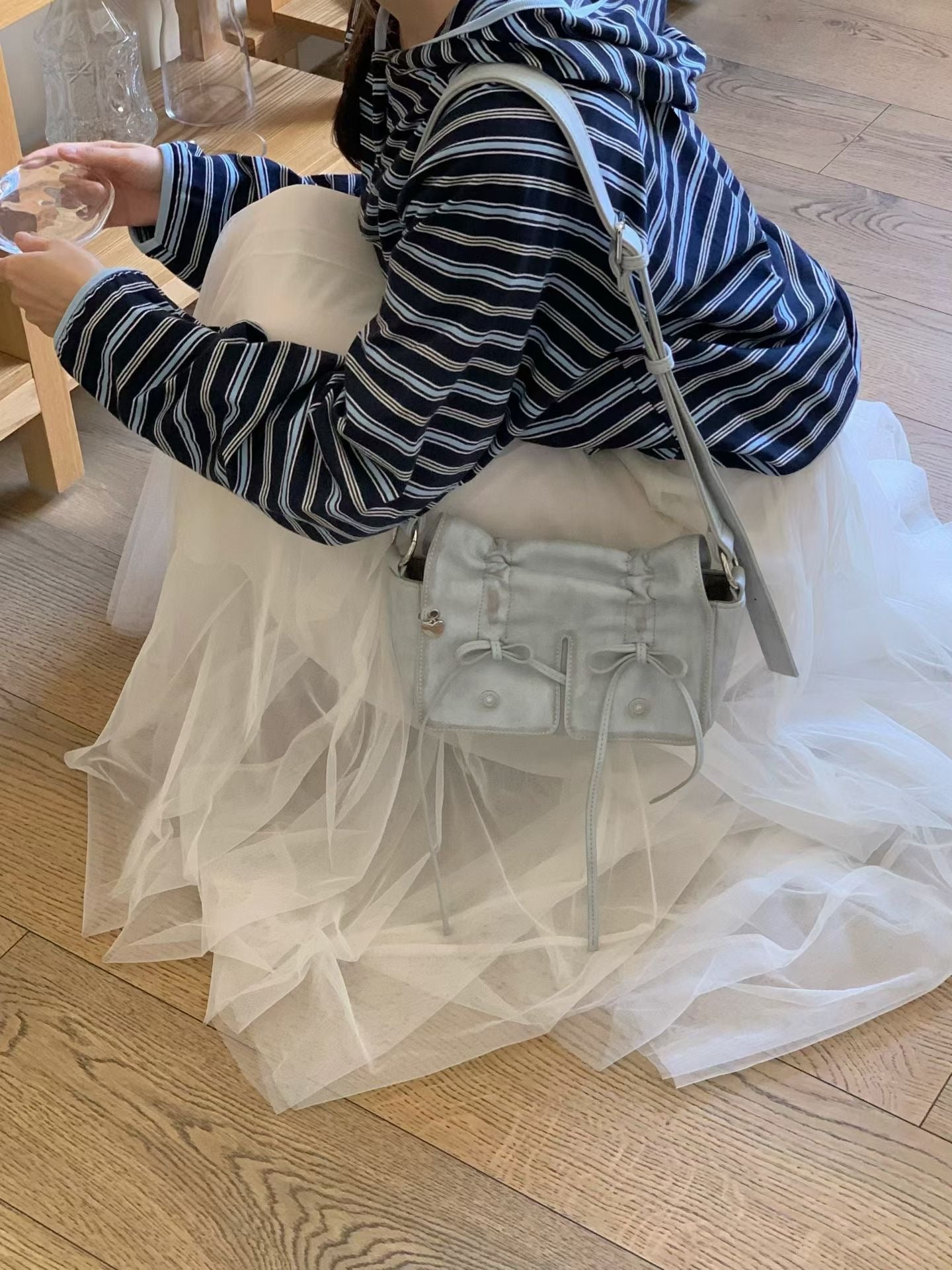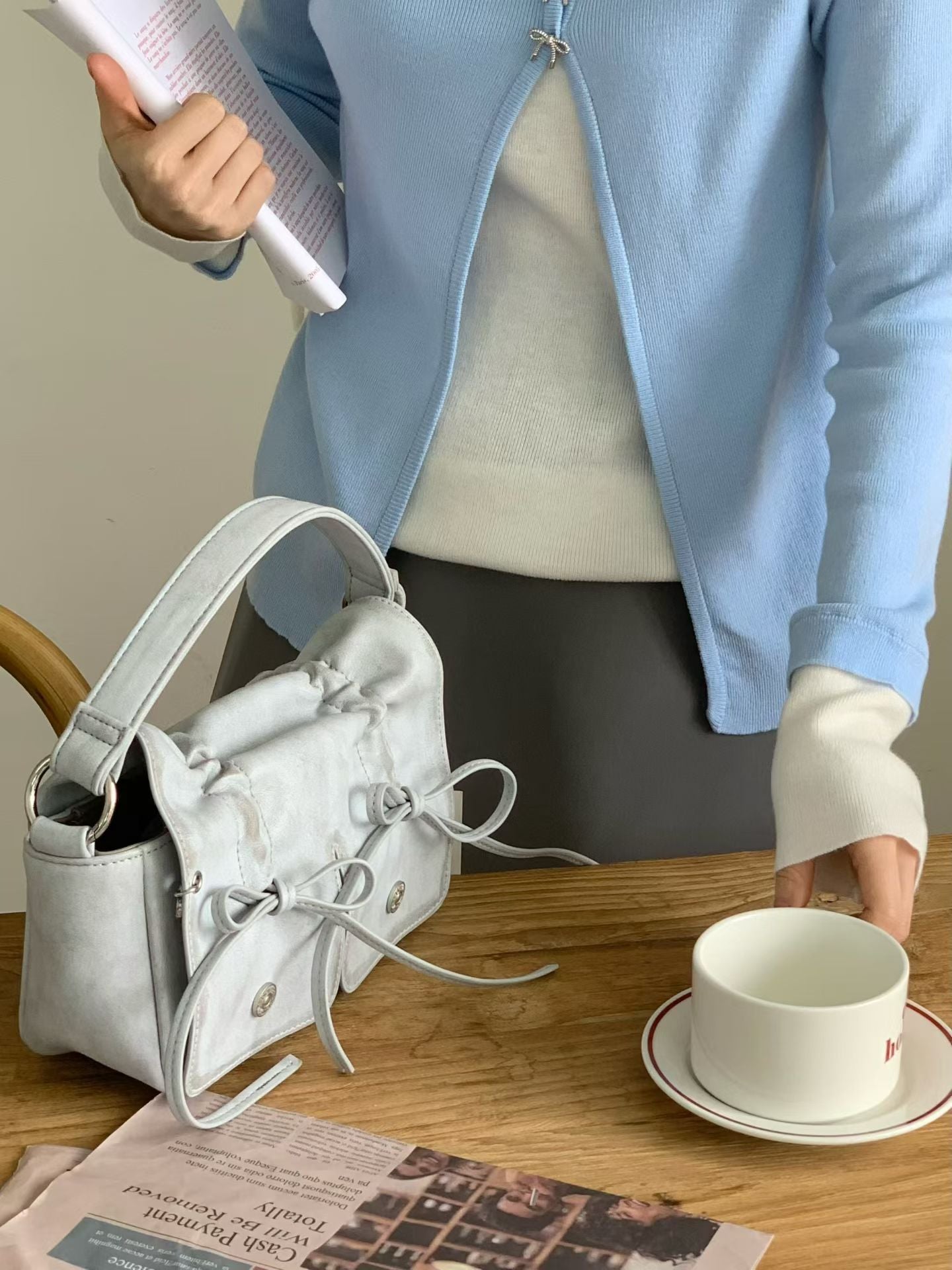 Grey Designer Brand Ribbon Leather Shoulder Bag (Large/Mini)