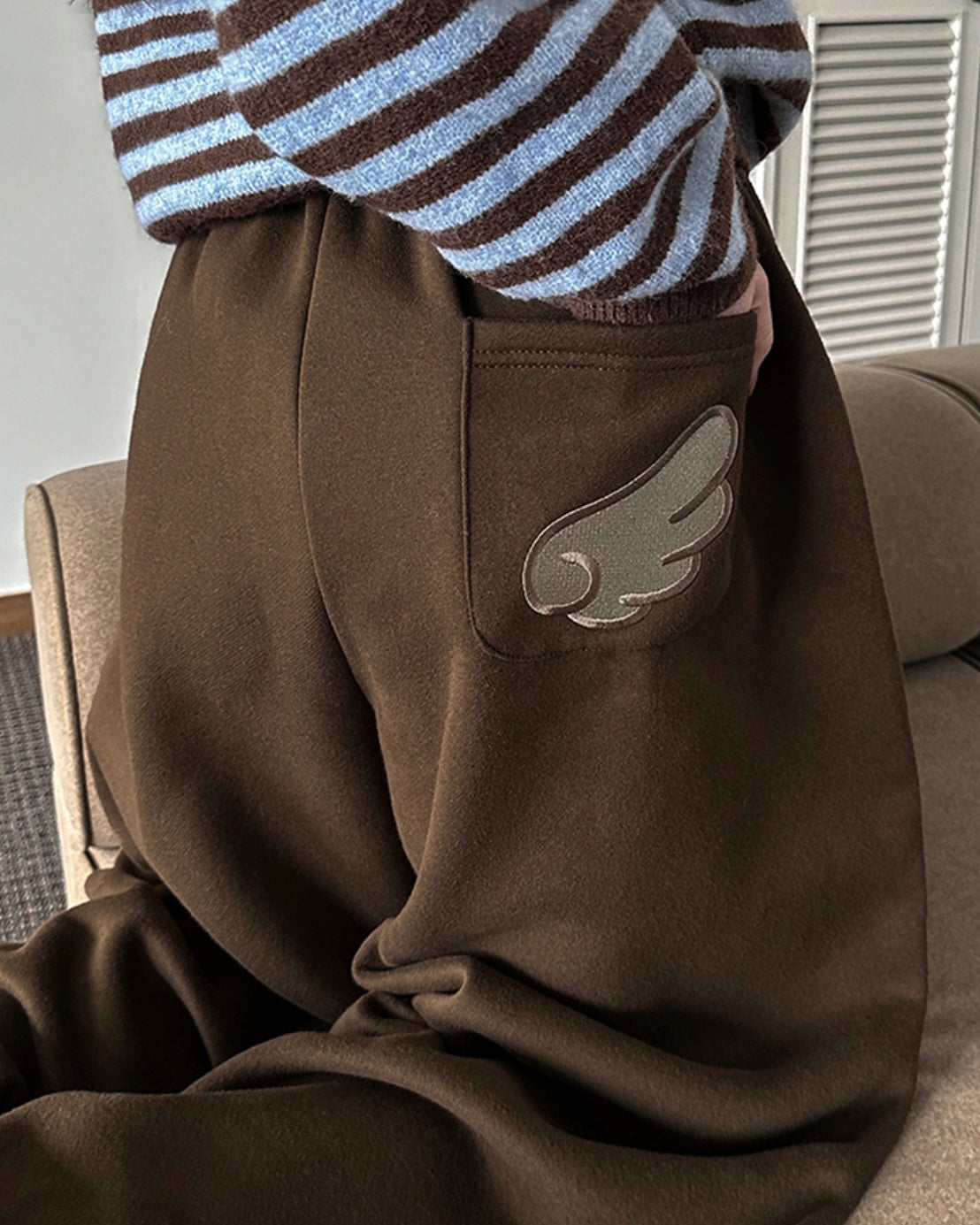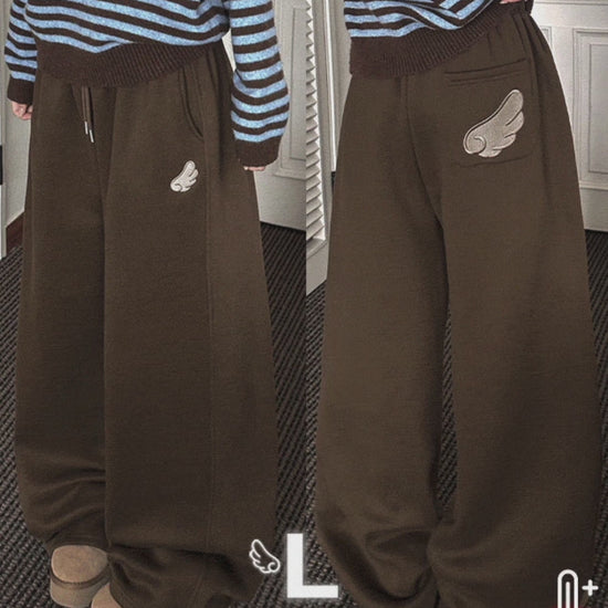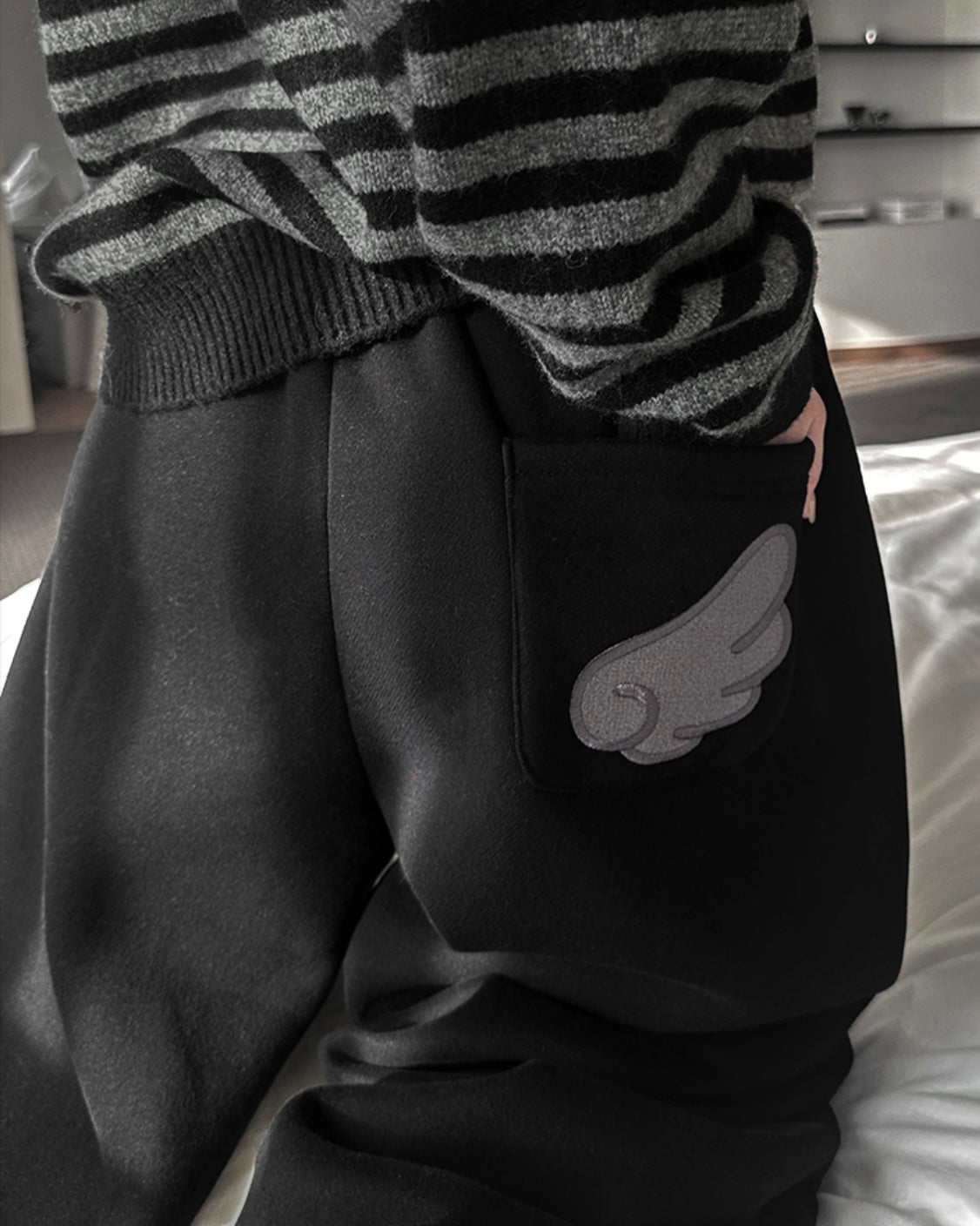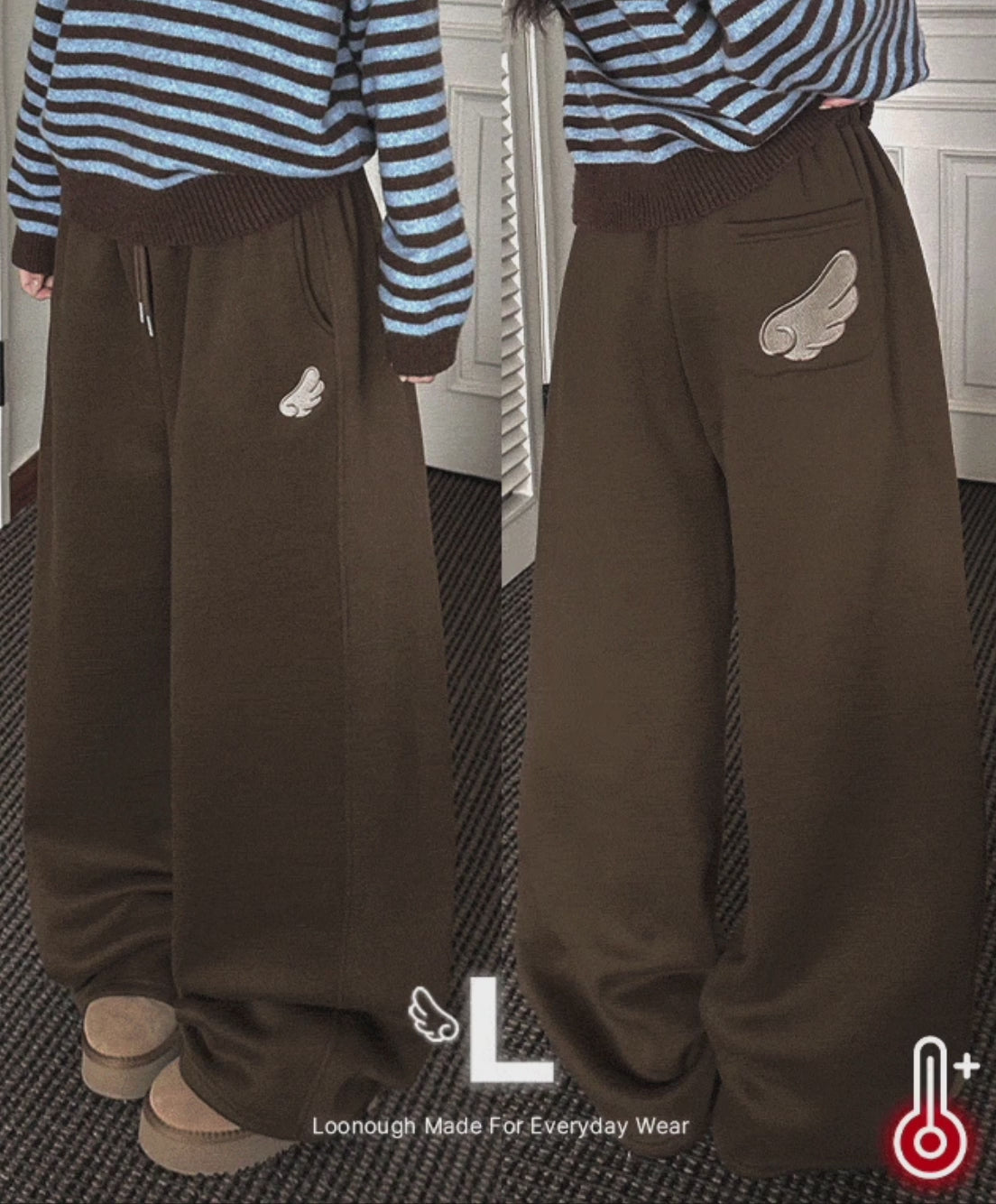 Niche Korea brand LOOXP wide-leg pants feature a cosy fleece lining for extra warmth without bulk. The cotton-poly blend delivers the soft natural feel of cotton with polyester's superior durability and shape retention. Thermal insulation technology locks in body heat while the reinforced fabric withstands rigorous workouts. Finished with elegant angel embroidery and cut-line banding details.