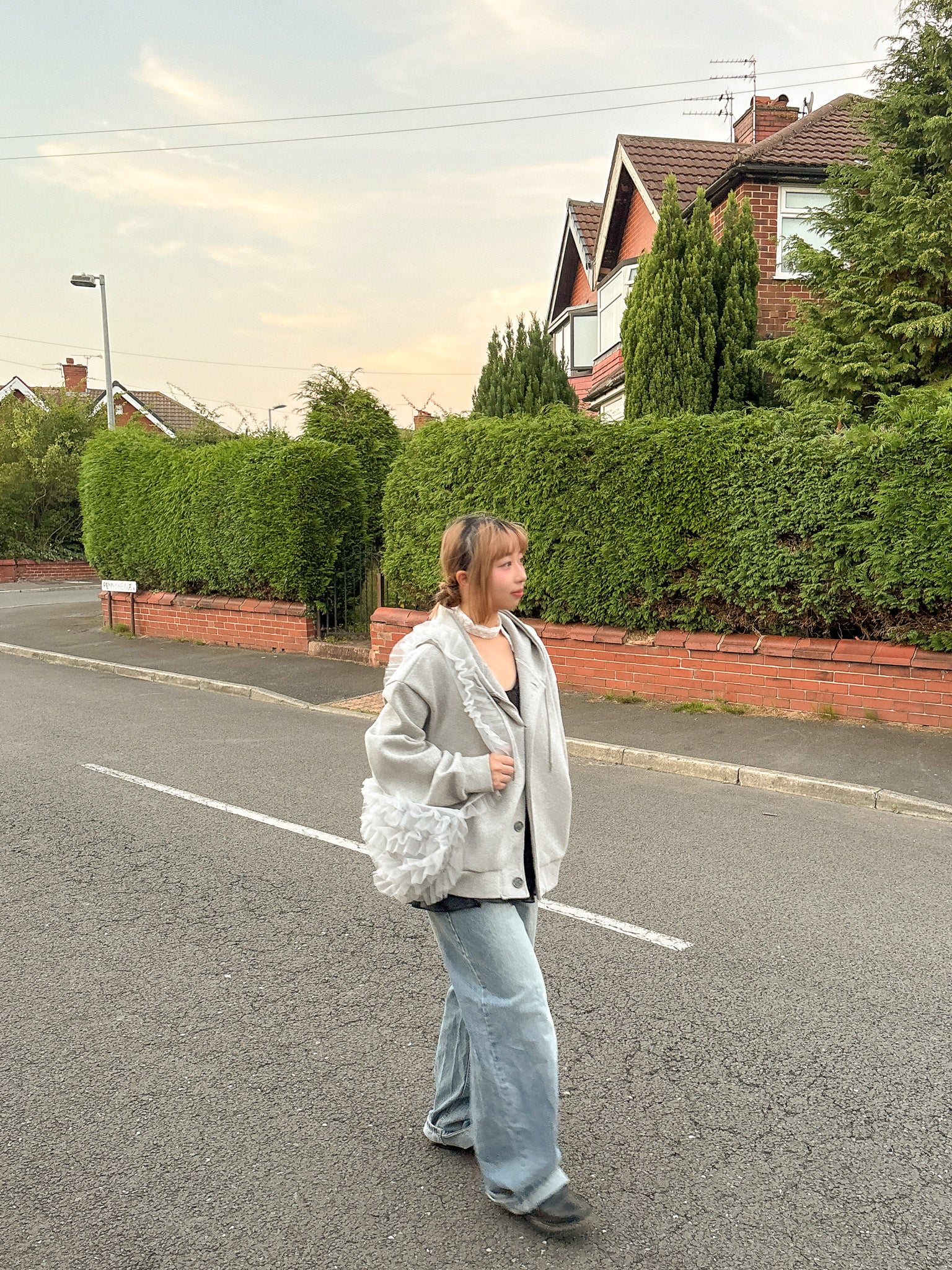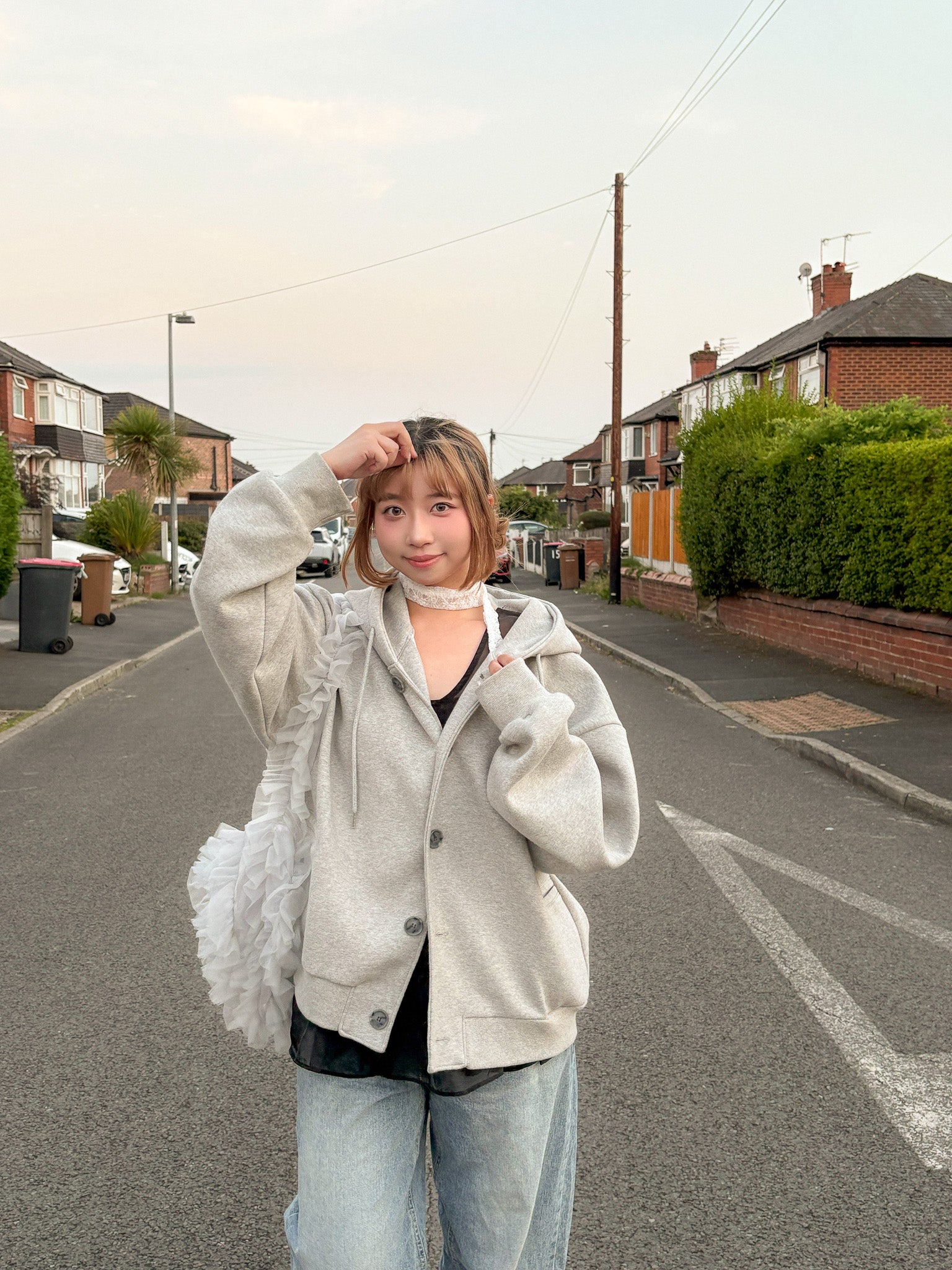 Introducing the Oversized Double-Knit Button Hood Zip-Up. This unisex hoodie features a double-knit composite for ultimate warmth and comfort. The overfit design, button hood zip-up, and fleece lining provide maximum coverage against the cold during Spring and Autumn in the UK.