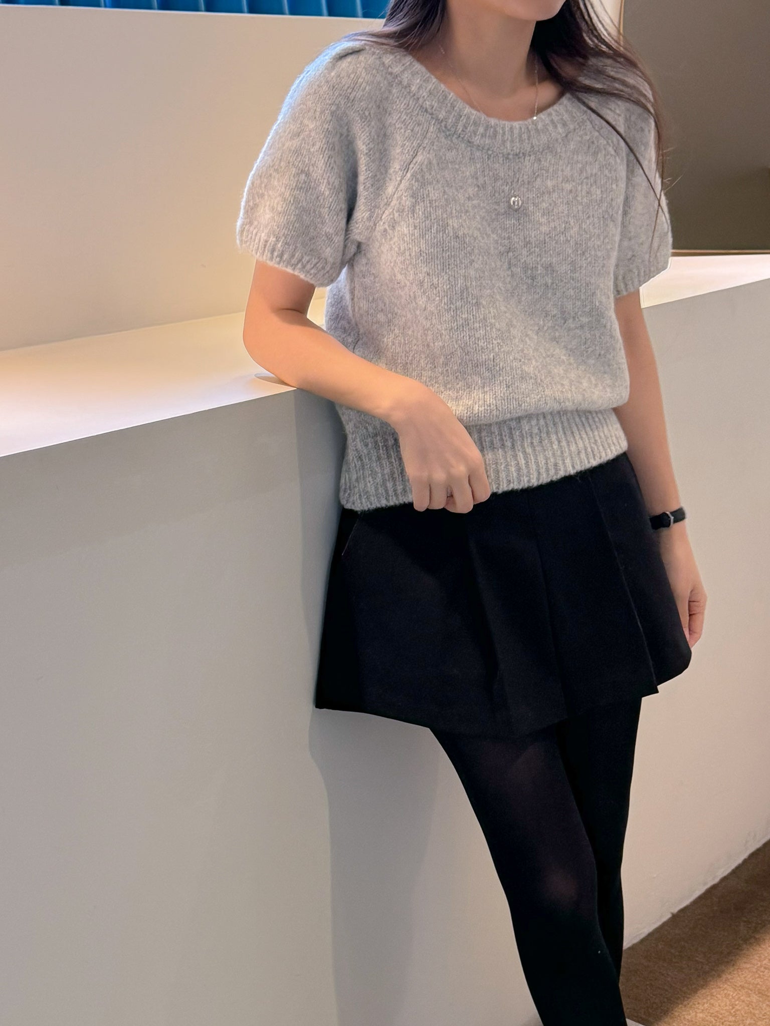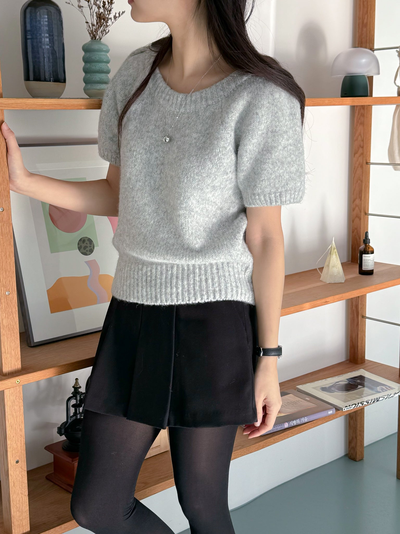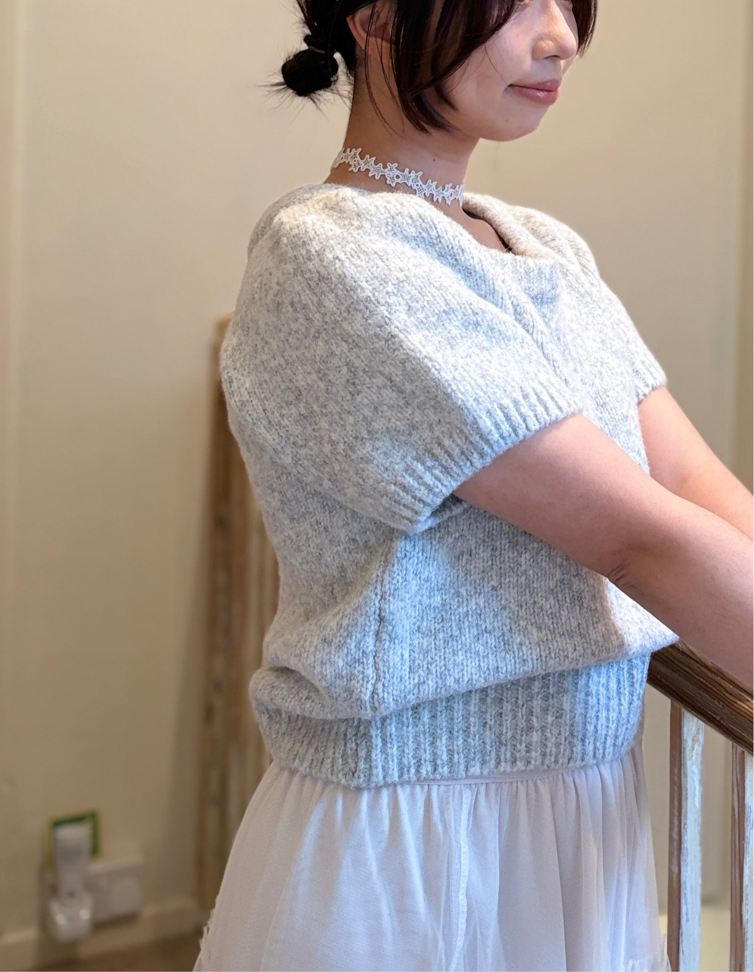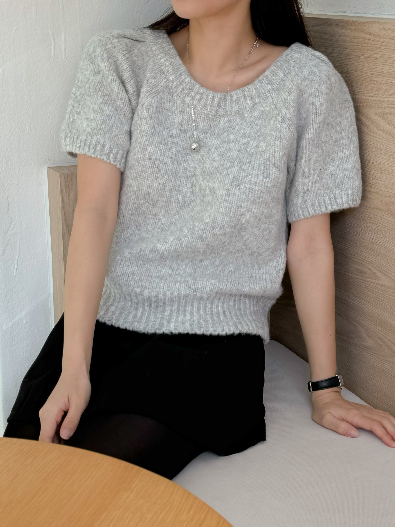 This Puff-Sleeve Knit Top is made with a round neck and short puff sleeves. The fabric has high elasticity and is not sheer.