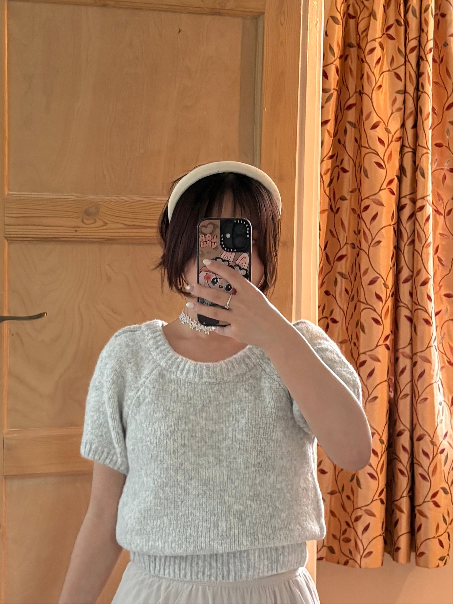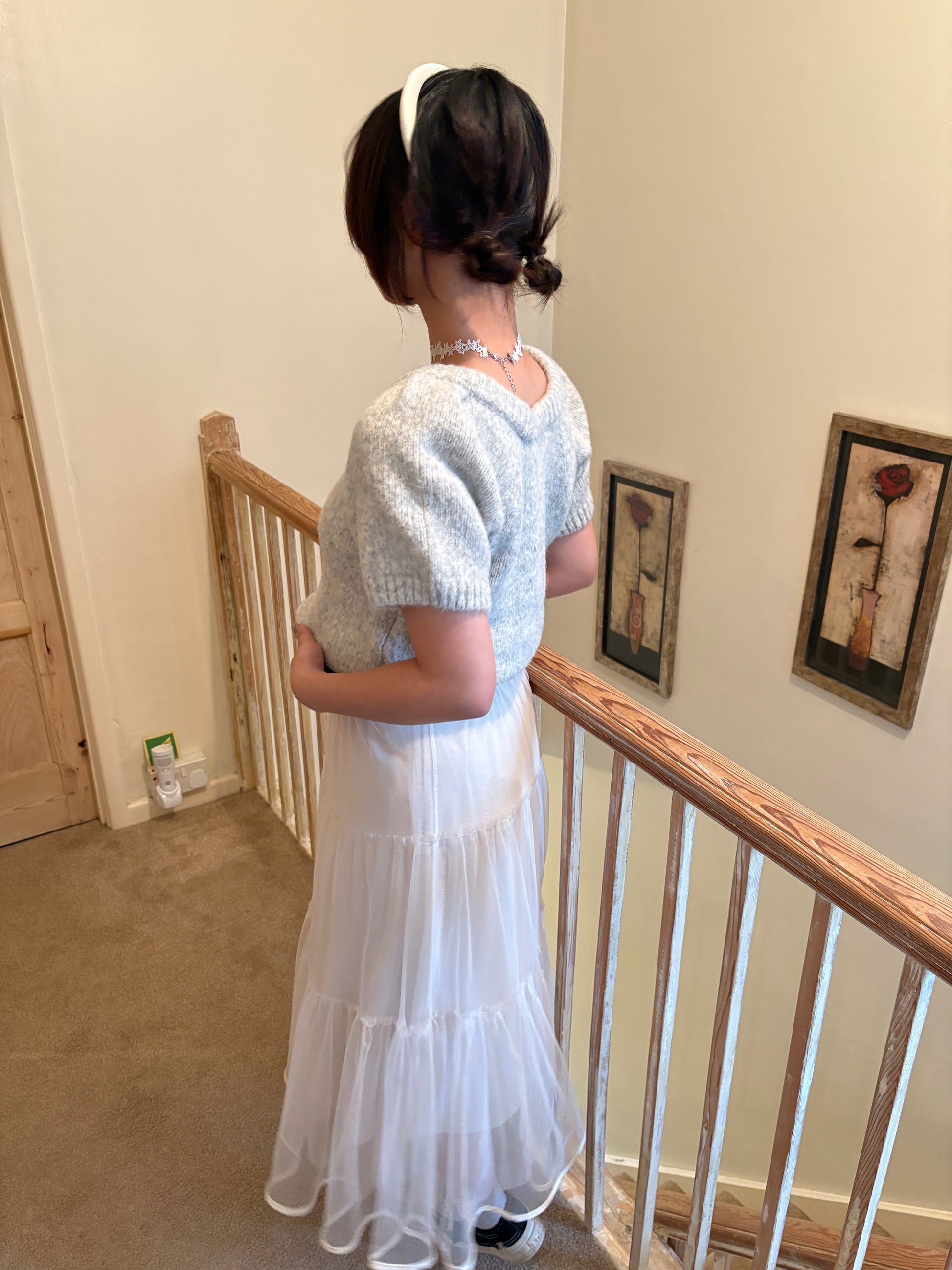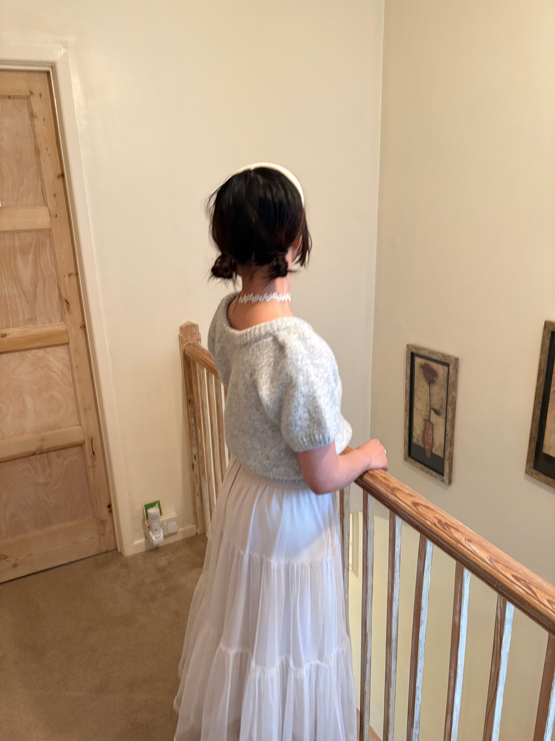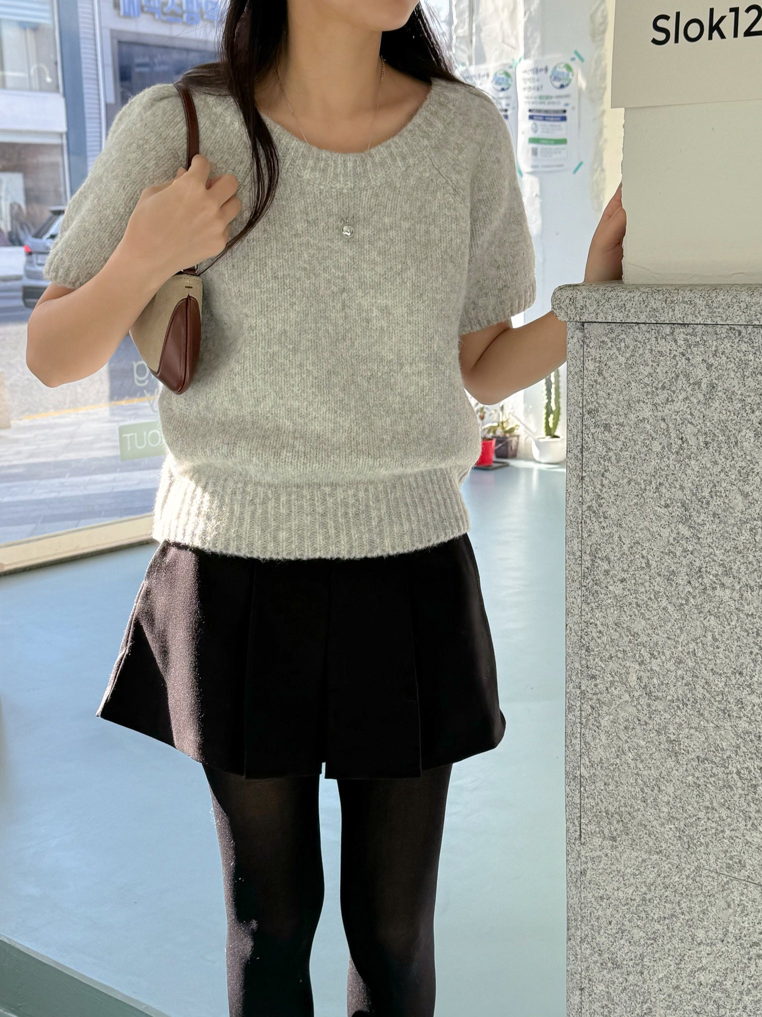 This Puff-Sleeve Knit Top is made with a round neck and short puff sleeves. The fabric has high elasticity and is not sheer.