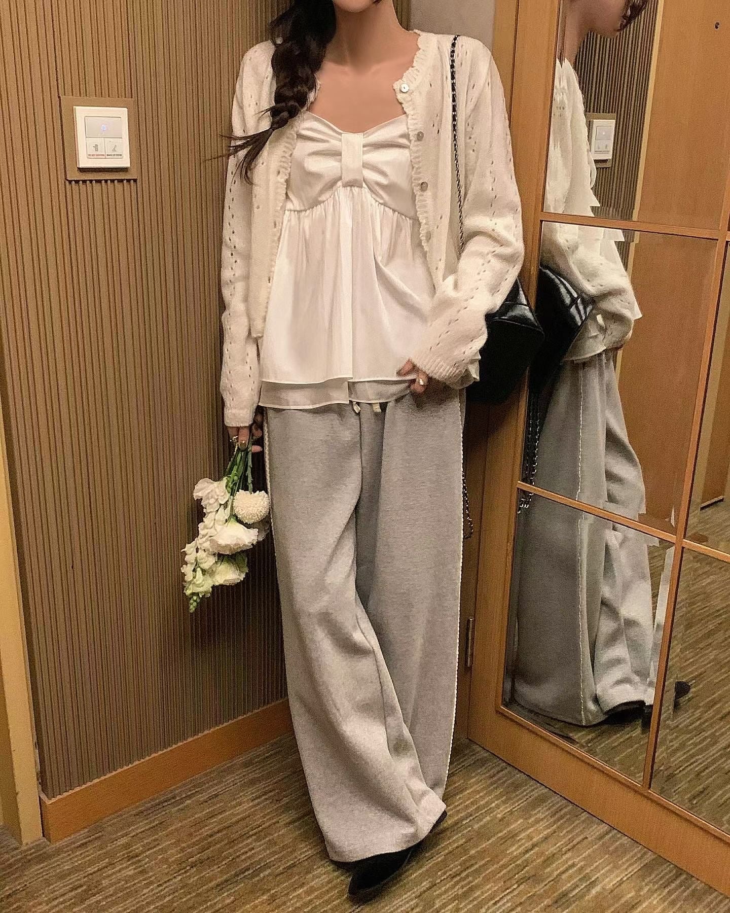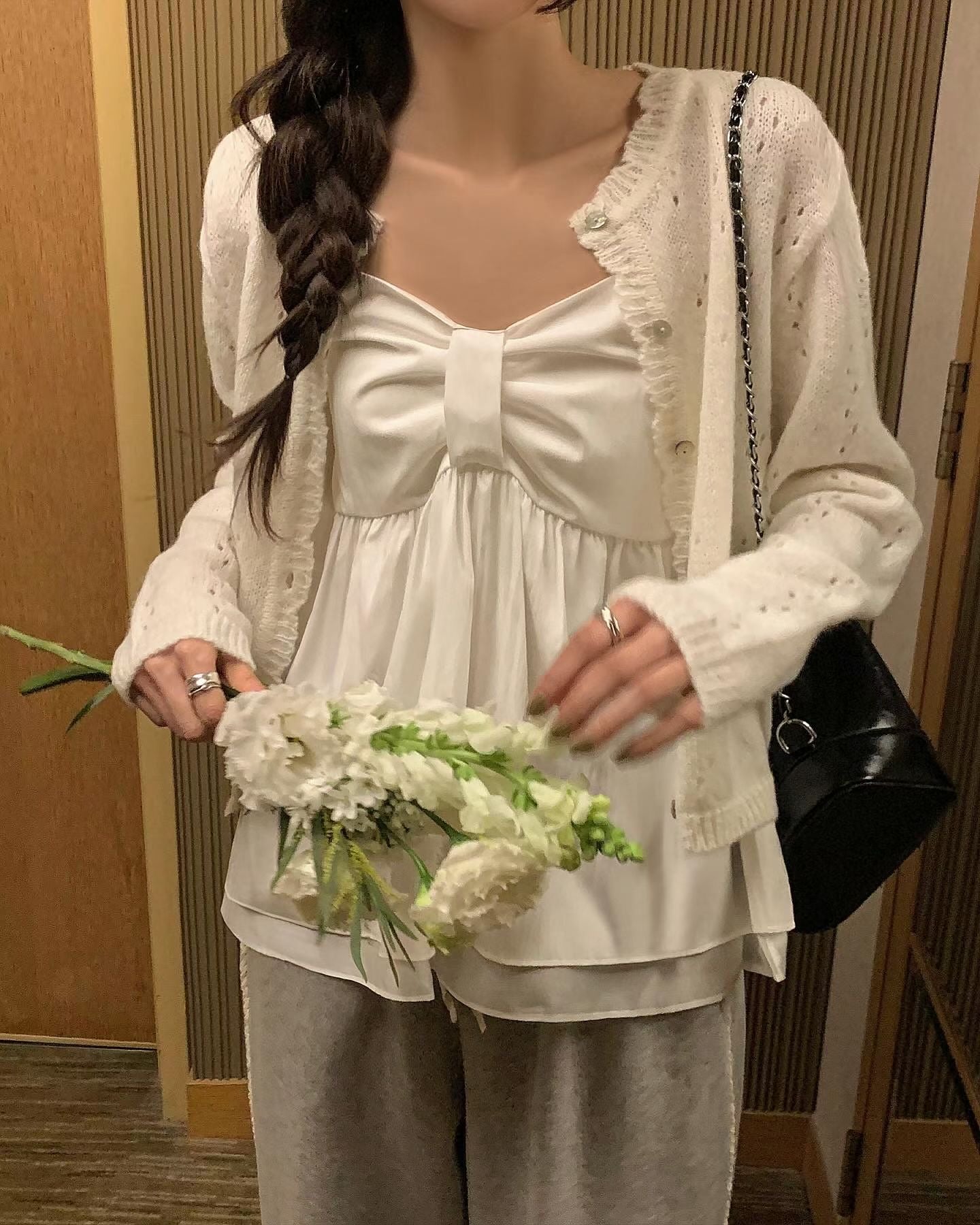 The Ribbon Chest Tank Top features a unique ribbon detail and an elastic band on chest area for a secure fit. Its adjustable length allows for personalized wear, while the soft material ensures breathability and comfort throughout the day. Ideal to wear it summer, or pair it with cardigan during Spring and Autumn.