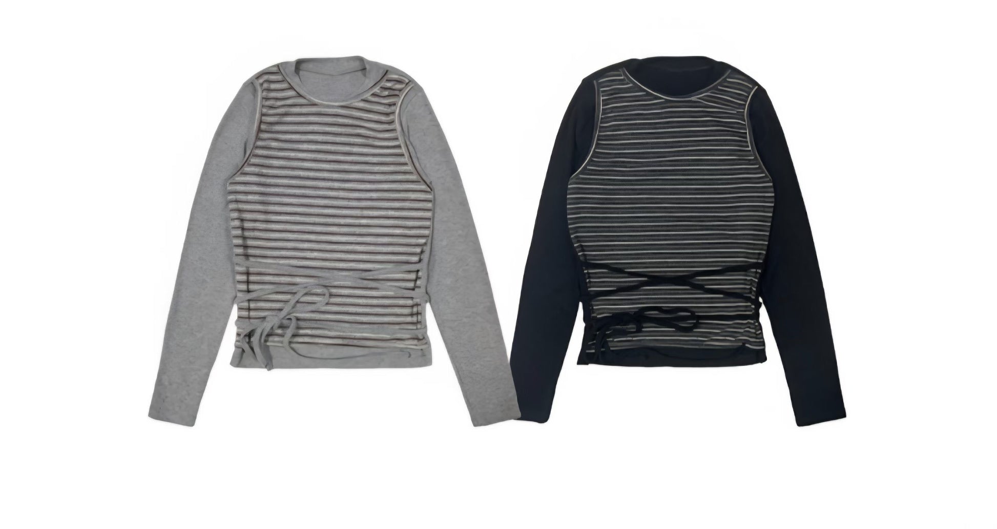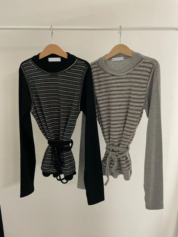 Striped Fake Two Piece Long Sleeve Tie Tee